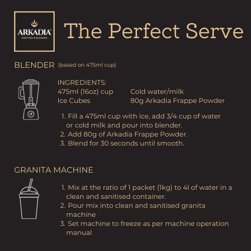 Arkadia master blenders have developed mixes that deliver true summer café indulgence. Suitable for blenders or granita machines.
