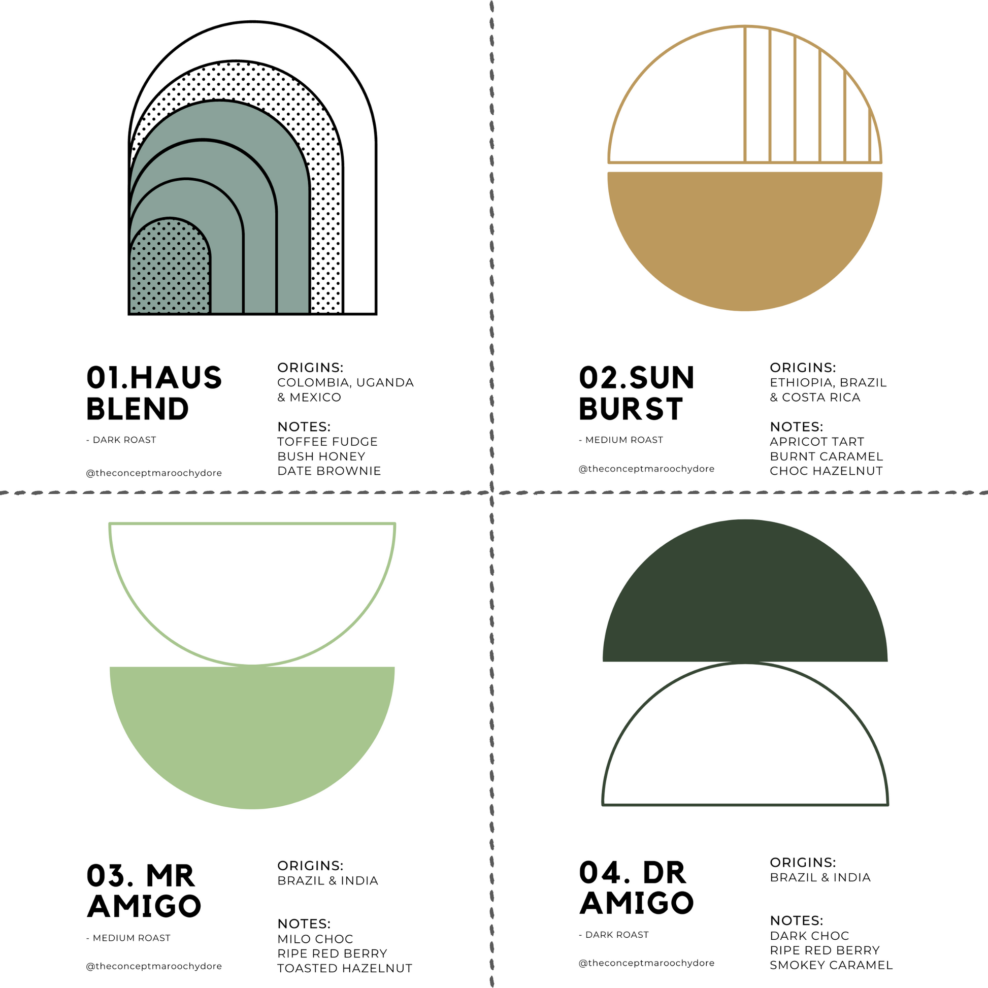 You'll receive a 250g bag of each of our all new refined The Concept Coffee blends, as well as a caramel and vanilla coffee syrup, along with a vanilla and a spice chai powder to compliment.